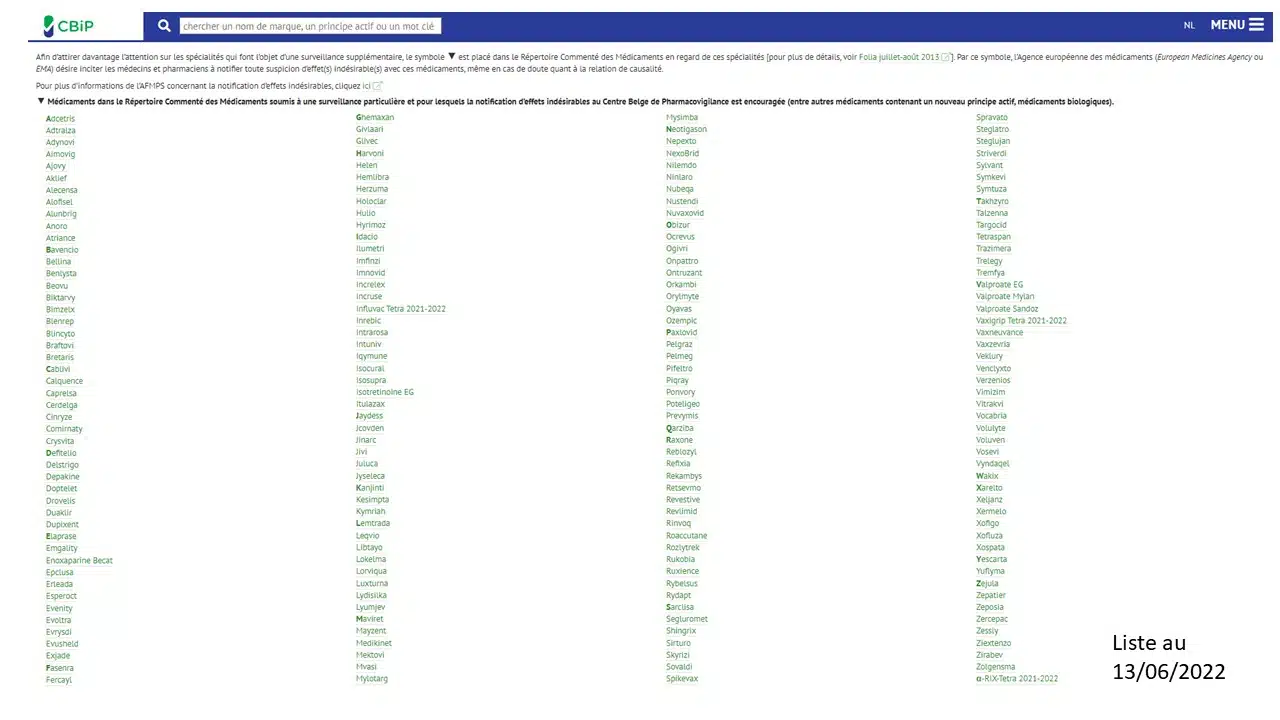 Liste des médicaments qui sont concernés par cette surveillance supplémentaire disponible sur le site du CBIP: cliquez ICI