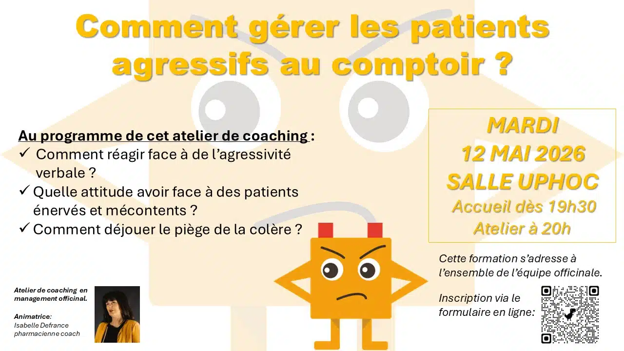Formulaire d’inscription: https://www.uphoc.com/inscription-atelier-de-coaching-gerer-les-patients-agressifs-au-comptoir-mai-2026